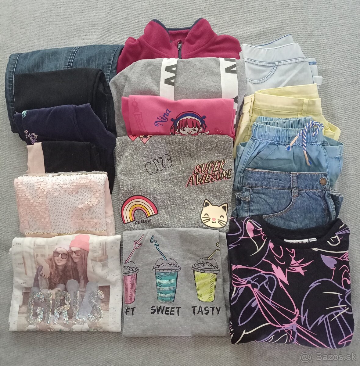 Predám balík oblečenia pre dievčatko vľk. 152-158: mikiny4x, trička s dľhym rukavom4x,rifľe2x, legíny3x, šortky4x. Osobny odber alebo plus pošta.