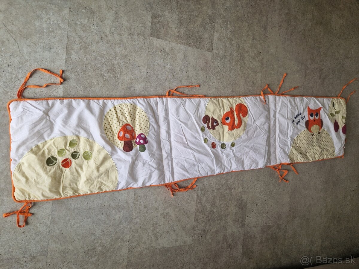Krásny kvalitný mantinel do postieľky z bio bavlny na 8 uchytiek. Naživo farby krajšie. Je opraty, stačí vyzehlit. Rozmer 170x38 cm