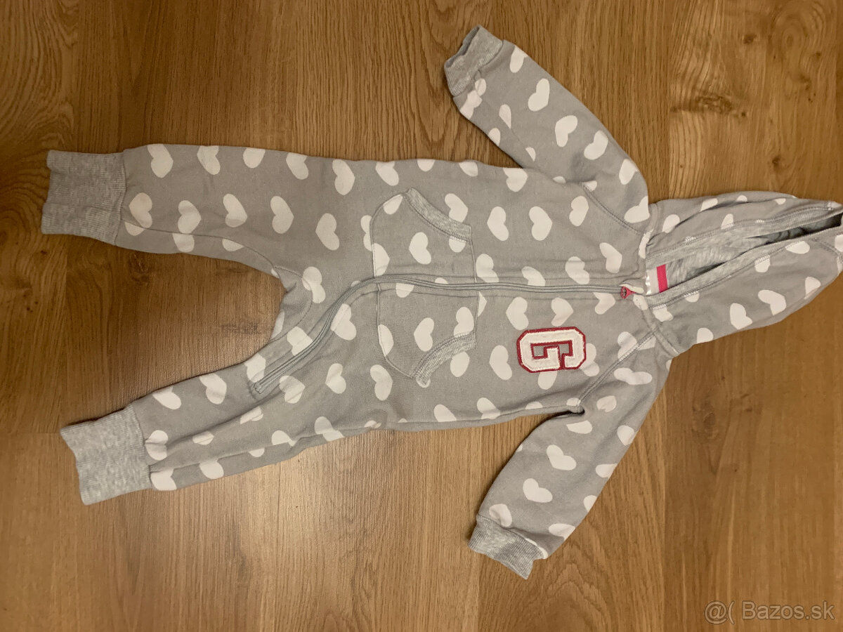 Predám teplákový overal šedej farby s bielymi srdiečkami, veľkosť 74, kupovaný v Pepco.