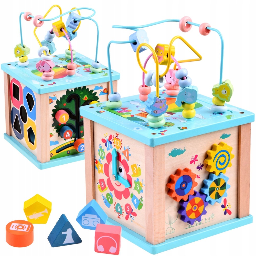 Drevená multifunkčná kocka rozvíja u detí hmat, zrak, motoriku, schopnosť vnímať a logicky myslieť. Drevená kocka obsahuje množstvo aktivít, obsahuje vložku, ozubené kolesá, obsahuje drevené hodiny a na vrchu kocky je labyrint. - Hračka je skutočným hlavolamom pre malé deti. Pomáhajú tiež rozširovať slovnú zásobu detí pri pomenovávaní vyobrazených predmetov a zvieratiek. Pomáha rozvíjať kognitívne, manipulačné a zrakové schopnosti.