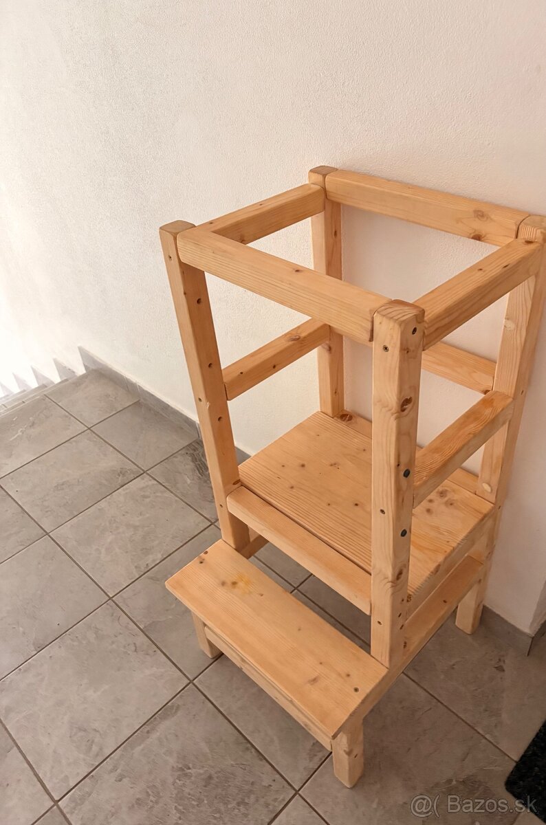 Drevená učiaca veža pre deti - [28.2. 2026]Predám drevenú učiacu vežu s nastaviteľnou výškou. Výborná pomôcka pre deti na pozeranie, lozenie a učenie sa. Deti tak pomáhajú pri varení v kuchyni. Deťom umožňuje bezpečne dosiahnuť na úroveň kuchynskej linky alebo stola a zapájať sa tak do spoločných aktivít.