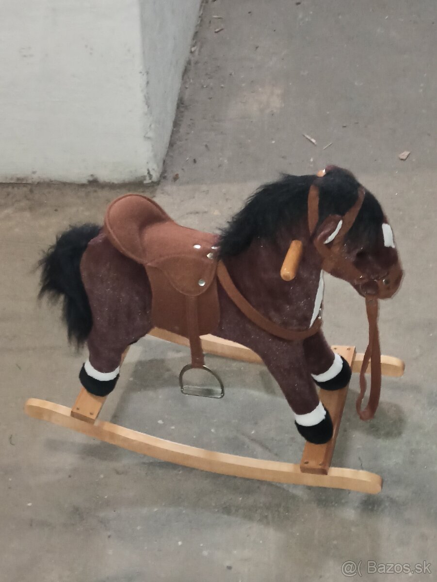 Posuniem hojdacieho koníka. Ako nový. Po stlačení uška vydáva zvuky (erdžanie). Materiál drevo a plyš.