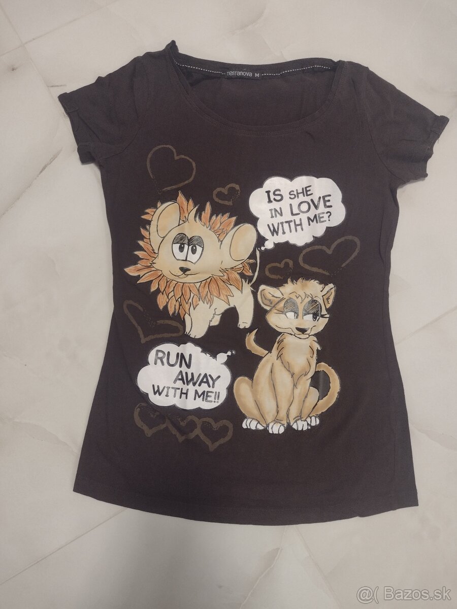 Predám zachovalé tričko tmavohnedej farby so zachovalou potlačou v 100% stave pre dievča v.M. Cena 2,50 €+ poštovné.