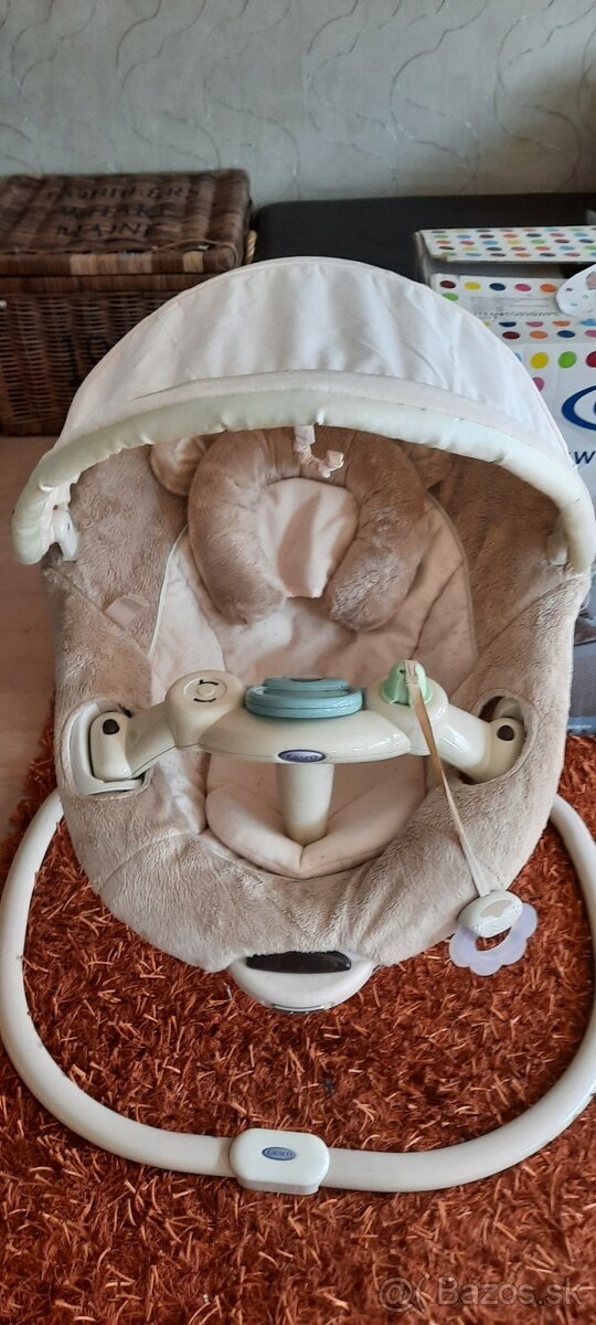 Predam znackove kresielko, hojdacku vo velmi dobrom stave.Hojadacka sa hybe z prava do lava, hra rozne melodie, dieta sa v nej tesi, ale aj moze v nej spinjat, lahko v nej aj zaspi.Je dostatocne vysoka, co umoznuje velmi dobry kontakt a manipulaciu s duetatom.