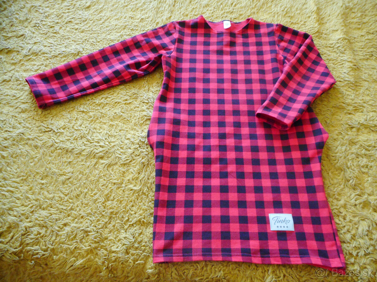 predám používané, nepoškodené dievčenské šaty s dlhým rukávom a vreckami, tuniku zn. Tinko veľkosť 140cm, zo stredne hrubého materiálu na prechod jeseň zima v kombinácii farieb vianoc čierna a červená farba, obliekanie cez hlavu, celková dĺžka tuniky je 70cm, šírka pod pazuchami 40cm, vonkajšia dĺžka rukávu od šitia ramena je 45cm