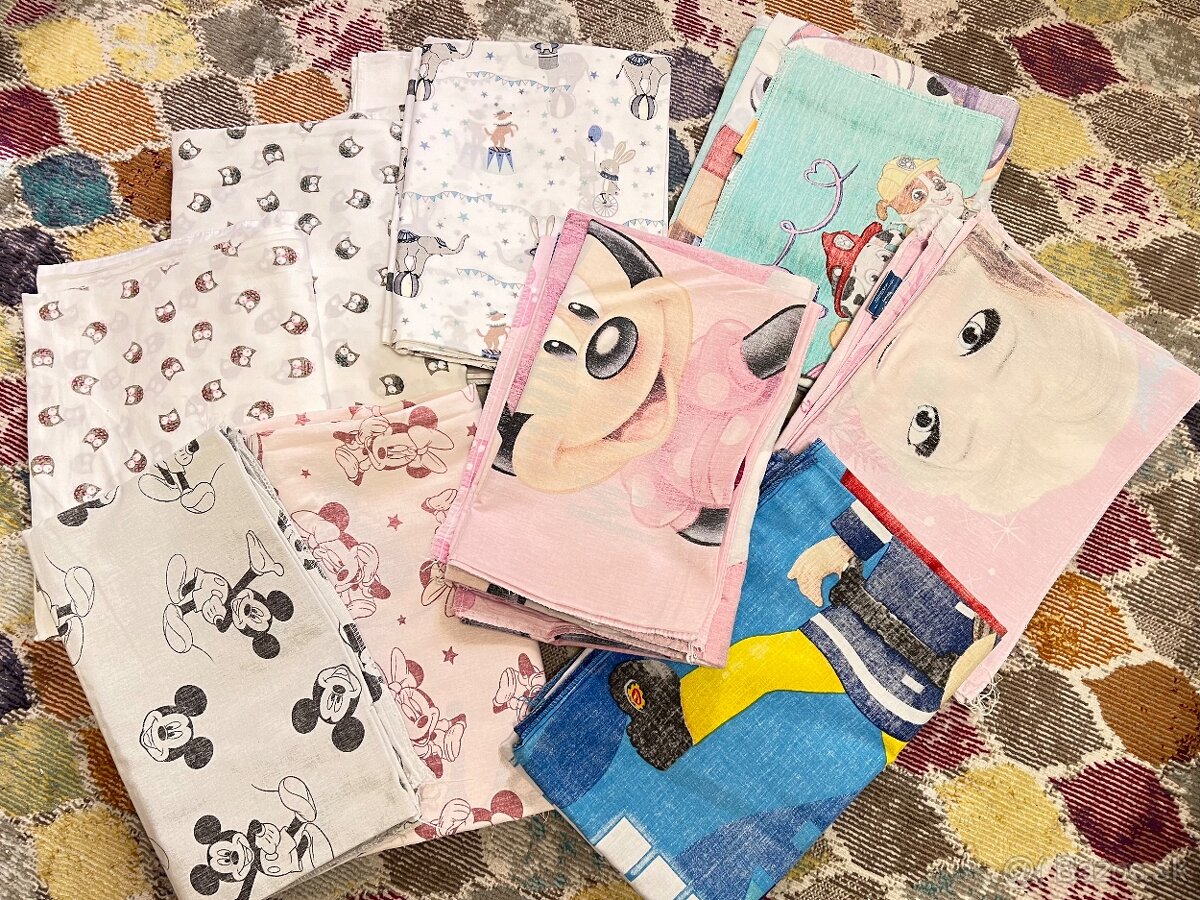 Predam za symbolicku cenu detske obliecky (vsetko rozmer paplon 135x100cm a vankusik 60x40cm). Motivy rozne: Minnie, Mickey, Frozen, Tlapkova patrola, Poziarnik Sam, zajaciky, sovicky.