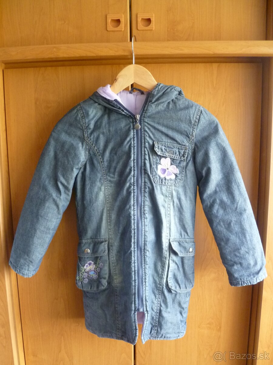 Dievčenská zimná riflová bunda - kabát, vo vzhľade used, predĺžená, nosená, zapínanie na zips, kapucňa sa nedá odopnúť, na bokoch dve vrecká., v dobrom stave Veľ. 134.
