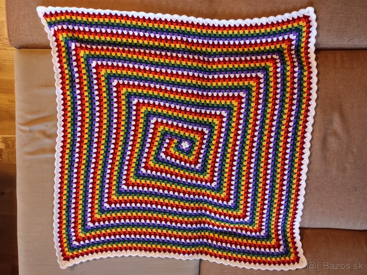 Predám celkom novú, ručne háčkovanú deku vo farbách dúhy, háčkovanú do špirály. Materiál: 90% akryl, 10% vlna. Rozmer: 90 x 90 cm.