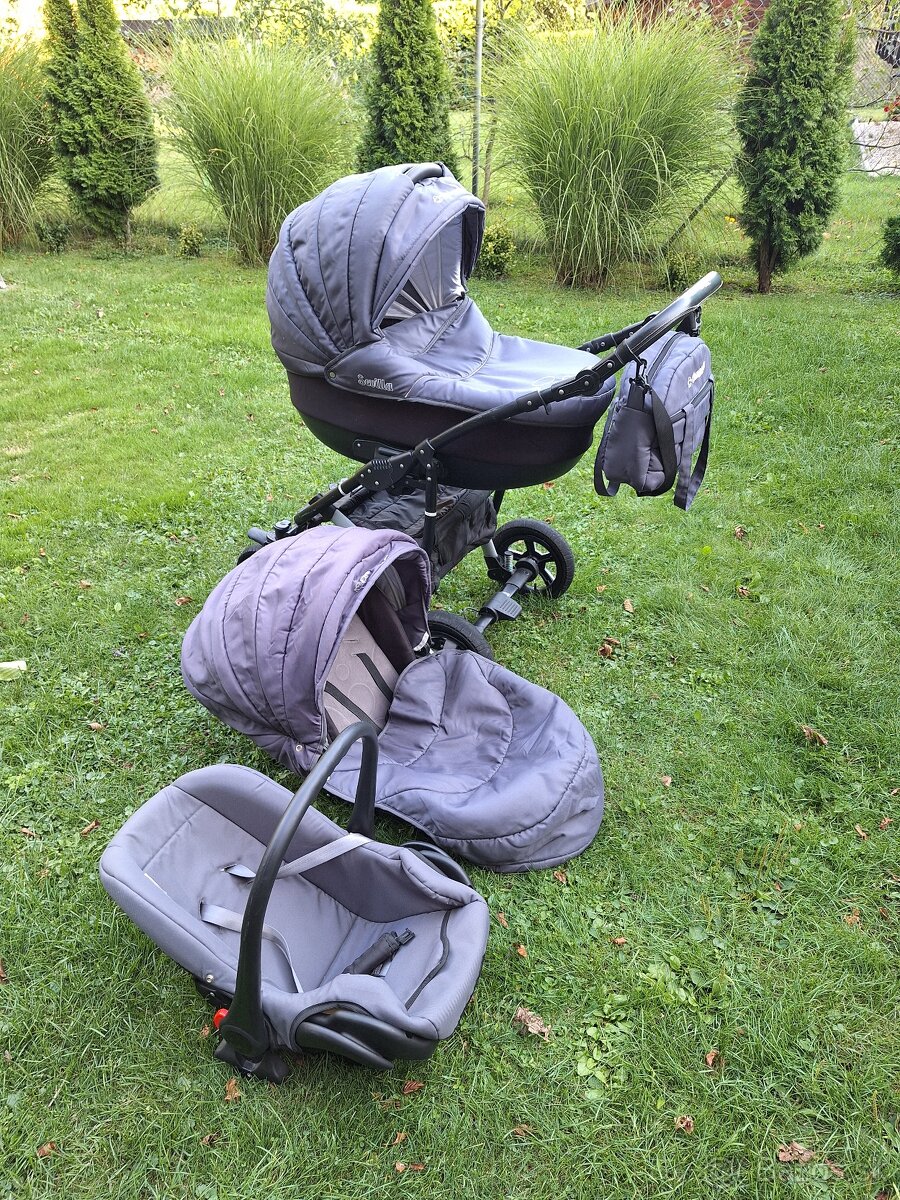 Tmavo sivý, trojkombinácia. Top stav. Po 1 dieťati. Jemne šuchnutý na konštrukcii. Látky bez fľakov, ako nové. V cene kryt na dážď a proti slnku.