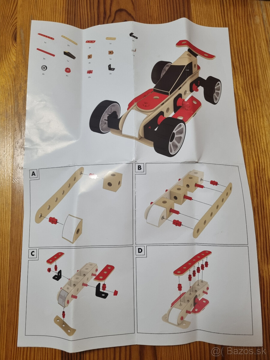 Kompletne 2 kompatibilne stavebnice - zakladne casti z dreva, dalsie casti (spojky, skrutky, matice a kolieska) z plastu.