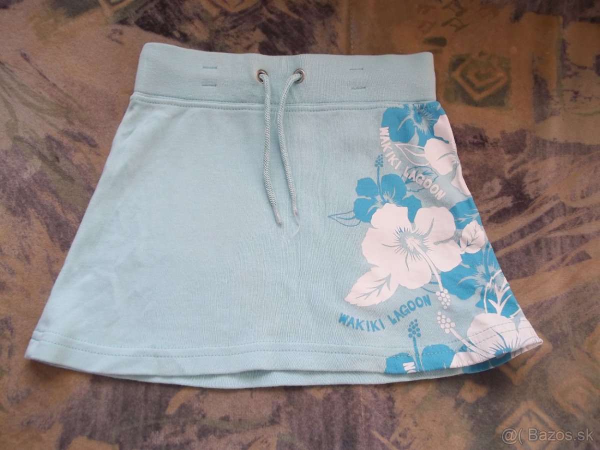 Predám bledomodrú sukňu s wakiki lagoon. V dobrom stave. Materiál: 100% bavlna. Veľkosť: 92. Výrobca: H&M. Šírka sukne: 24 cm. Dĺžka sukne: 25 cm.