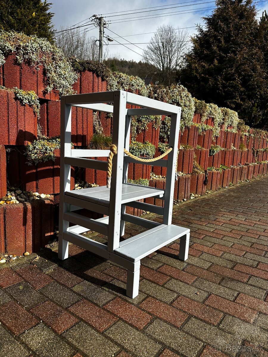 Uciaca veza - [1.3. 2026]Uciaca vez (kitchen helper / Montessori): Stabilna drevena veza do kuchyne, dieta je pri linke v bezpecnej vyske. Je ok, ale ak dostane novy nater, bude ako nova (tie biele dosky sa daju odobrat, boli pridane kvoli extra bezpecnosti).