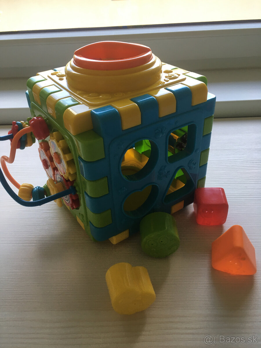Ponúkam na predaj hraciu kocku pre najmenších. Dajú sa vkladať tvary, prevliekať labyrint, stláčať, posúvať, hrkať, hrá melódiu.