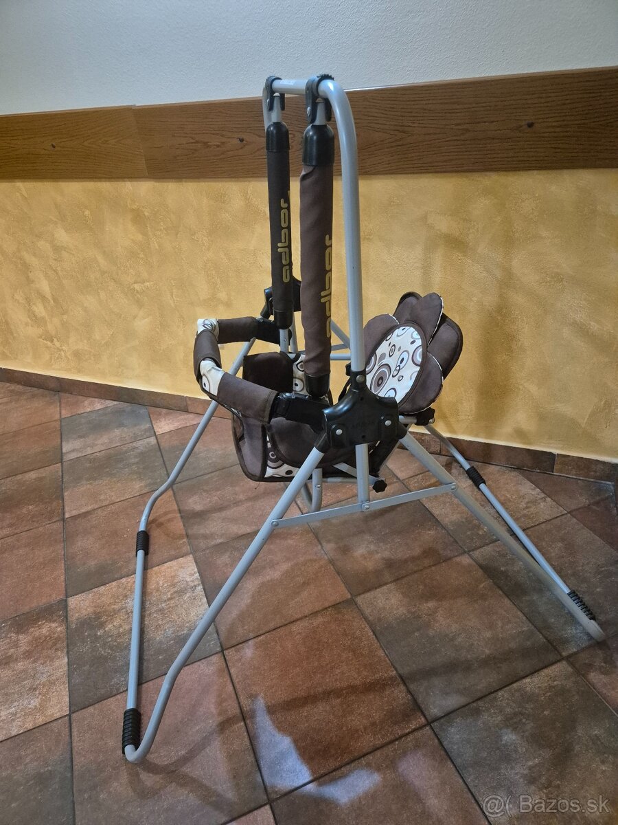 Prenosná detská hojdačka s kovovou konštrukciou. Sedadlo má bezpečnostné popruhy a je zdobené vzorom s kruhmi v hnedých a bielych odtieňoch. Hojdačka je určená na použitie v interiéri alebo exteriéri a je navrhnutá tak, aby sa dala zložiť pre ľahšiu prepravu a uskladnenie. Nosnosť do 15 kg.