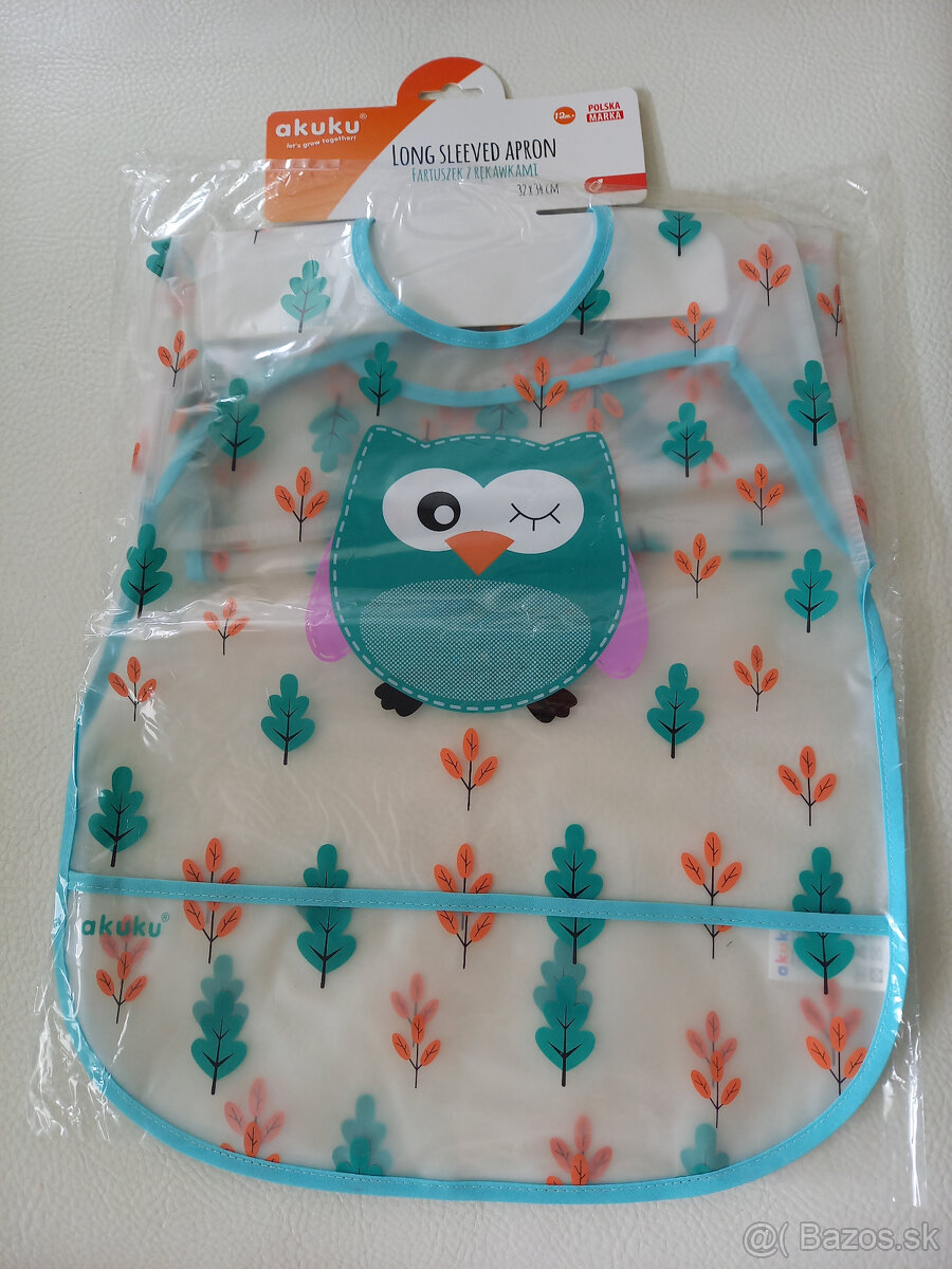 Predám 2 detské podbradníky značky AKUKU, vzor slon a sova. Podbradníky majú dlhé rukávy a veľkú kapsu, ktorá zadrží zvyšky jedla. Sú vyrobené z ľahkého, mäkkého a ľahko umývateľného materiálu EVA. Zapínanie na suchý zips. Po použití treba podbradníky umyť teplou vodou a detským mydlom.