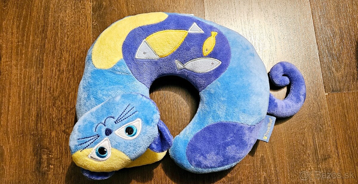 Detsky cestovny vankus na krk - TravelBlue, Kitty the cat. Vo vybornom stave, vnutro bez poskodeni, rovnomerne, jemne, "nezlomene", pouzity raz, ale nepasovala velkost, krasne farby. Jedina zavada je malicky fliacik 3mm na tretej foto,spadol na zem. (PC 30 Eur)