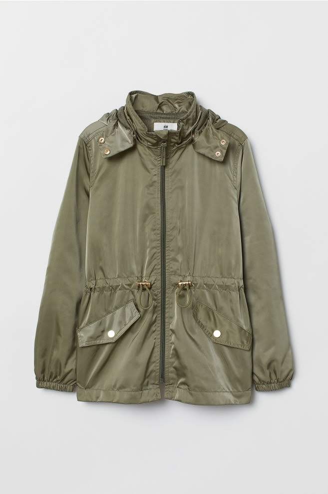 Ľahká bunda H&M veľkosť 170. Farba khaki, kapucňa sa dá odopnúť, v páse sa dá stiahnuť, podšitá. Pár krát oblečená, super stav.