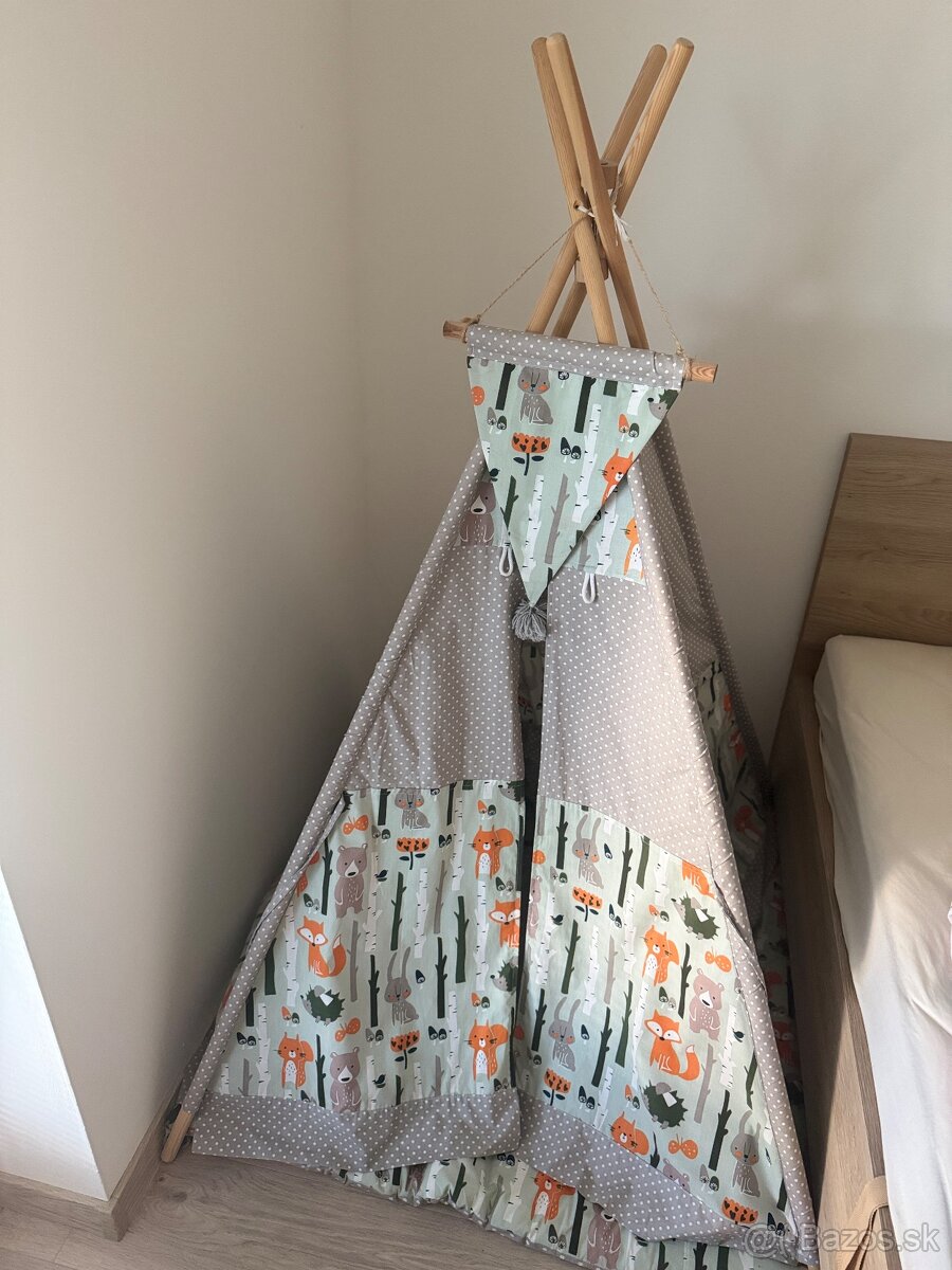 Detský teepee stan 180cm - [6.1. 2026]Rozkladací teepee stan, drevo + bavlna, opraté, na jednom mieste zašívané - viď foto. Výška tyčiek je 180cm.