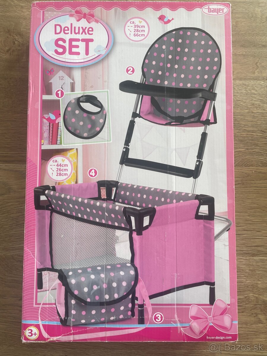 Vhodné pre bábiky do 46 cm. Jednoduchá montáž. Vhodné pre deti od 3 rokov. Obsah balenia: postieľka, stolička, taška, podbradník Rozmery: