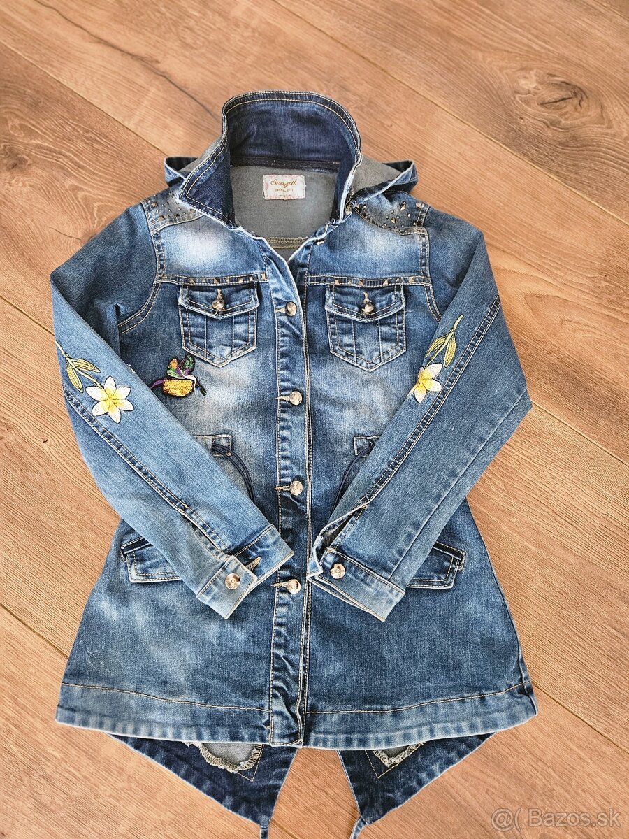 Predám dievčenský džínsový kabátik č.134, so šnúrkami na stiahnutie v páse. Moderný dizajn, s peknými farebnými výšivkami.