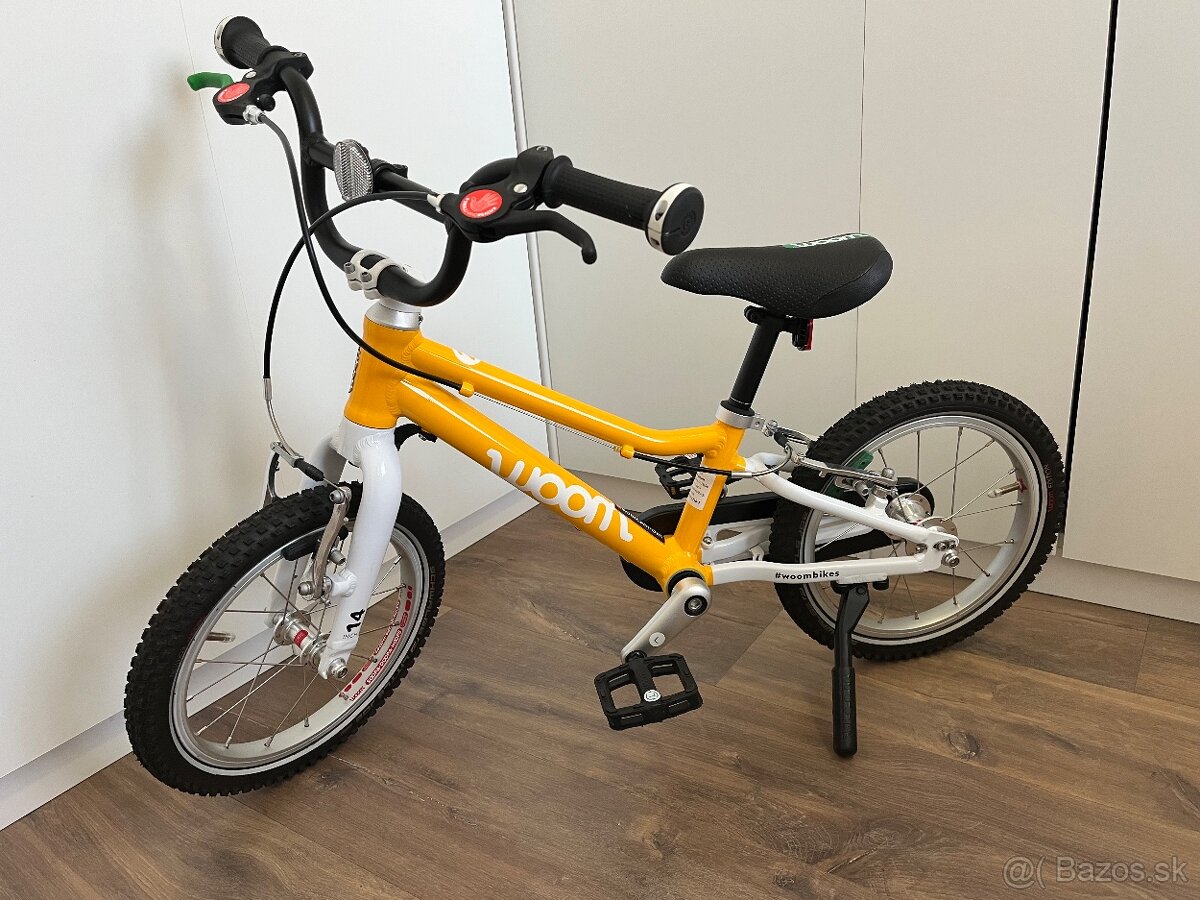 Ponúkam na predaj detský bicykel woom 2, veľkosť 14’’. Určený pre deti od 2 - 4 rokov. Bicykel sme využili na prechod z odrážadla na pedále. Do 5 min. sme vedeli bicyklovať. Potom sme spravili 5 výjazdov po cyklochodniku a prešli sme na 16’’ model. Bicykel je v TOP stave. Jemné škrabance (získané pri učení) na fotkách. Len osobný odber v LM. Súčasťou originálny stojan.
