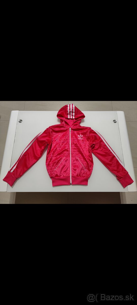 Predám krásnu dievčenskú ružovú Adidas mikinu. Nosená v dobrom stave, ale trocha sa páre pásik na rukáve. Rozmery viď foto.Pozri aj ďalšie moje inzeráty.Seriozne!!!