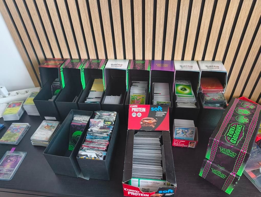 Mám tam sety zo sérií - Scarlet & Violet, Paldea Evolved, Obsidian Flames, Twilight Masquerade, Shrouded Fable - skoro kompletný chýbajú dve karty v základe, Surging Sparks, Prismatic Evolution, Journey Together, Destined Rivals.