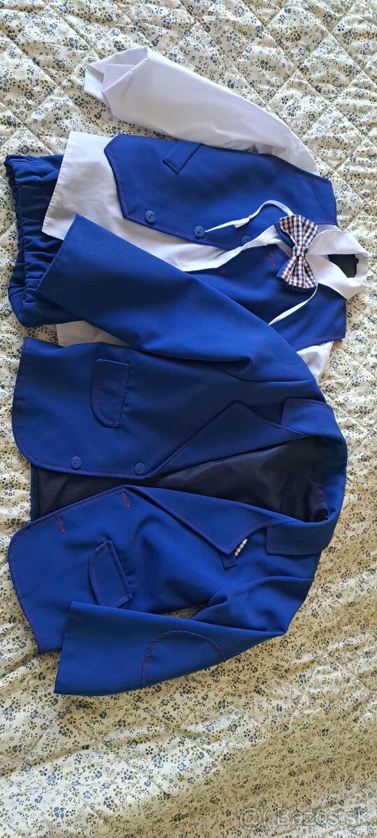 Detský oblek - [8.1. 2026]Predám oblek,oblečený jeden krát. Sako veľ.134.Nohavice veľ. 146.Farba modrá. V prípade záujmu premeriam.