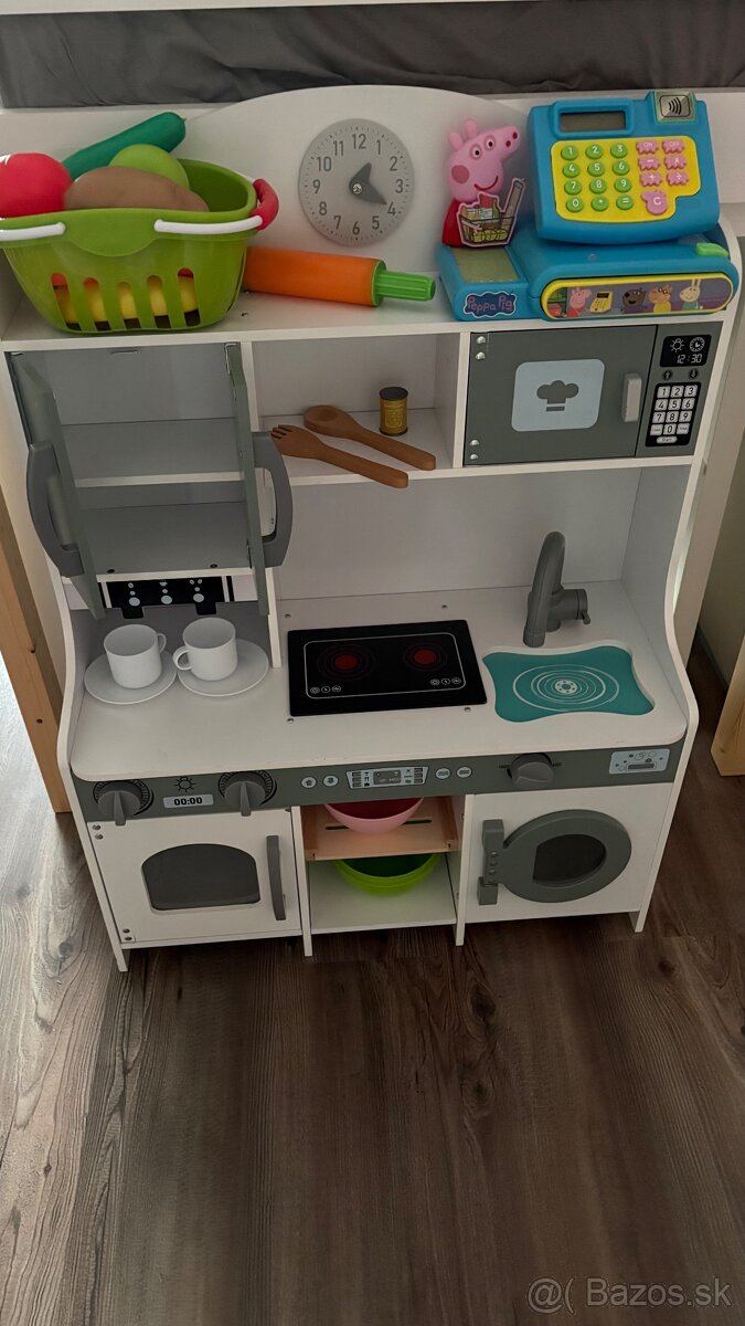 Pár estetických chýb sa určite nájde ale stále krásna a použiteľná. Mám k nej aj niektoré časti náhradné, je to odložené takže si niesom istá ale mali by byt dvierka od pračky, jeden celý bok kuchynky, pri zaujme to pozriem.