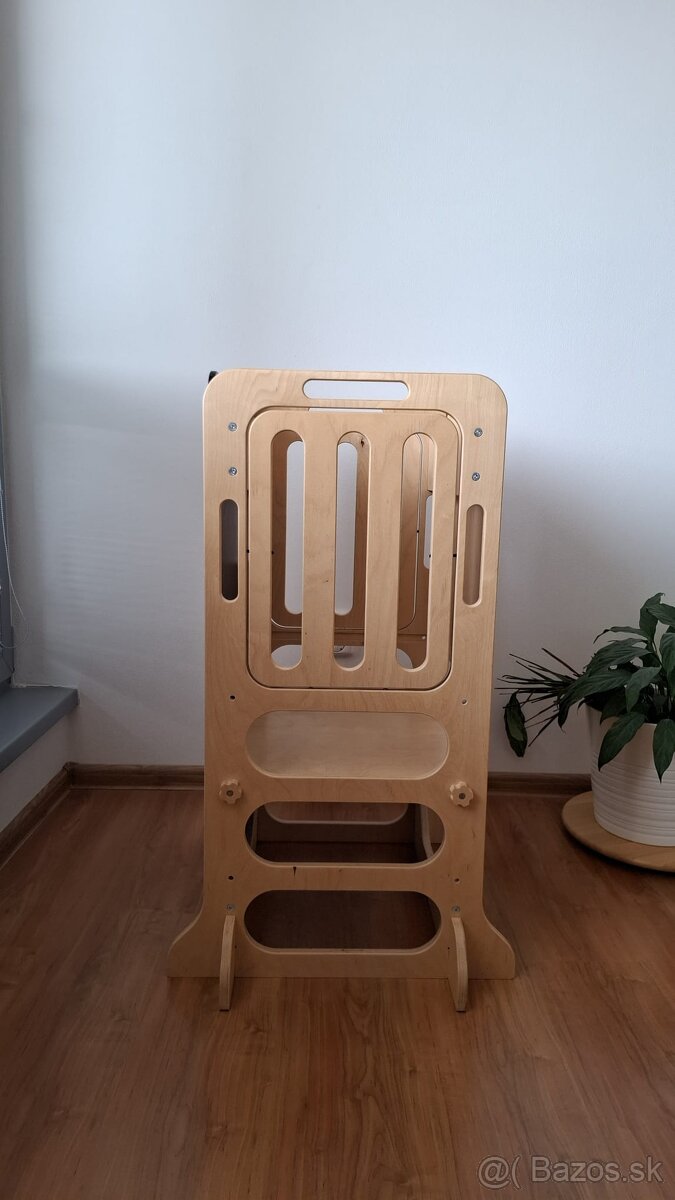 Montessori učiaca veža v prevedení LIGHT ponúka štyri bezpečnostné steny a preto je určená pre najmenšie deti, ktoré už ale vedia samostatne stáť. Bočné bezpečnostné steny sa dajú dať neskôr jednoducho dole a dieťa môže do veže/ z veže slobodne samo vyliezať za pomoci rebríčku po oboch stranách.