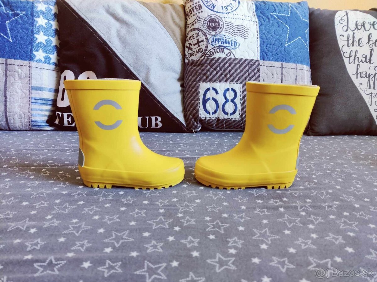 Predám detské gumáky Mikk-Line Sunflower, veľ. 22, vhodné na užšiu až stredne širokú nohu. Zvršok je vyrobený z prírodnej gumy,ide o vyšší strih, kde výška sáry siaha zhruba do trištvrte lýtka. Podšívka je z textilu, možno ich nosiť aj naboso. Textilná stielka je rovná, zo spodnej strany je nalepená penová výstuž pre podporu klenby. Stielka je vyberateľná. Protišmyková gumená podrážka je dobre ohybná, trochu tuhšia v oblasti päty.