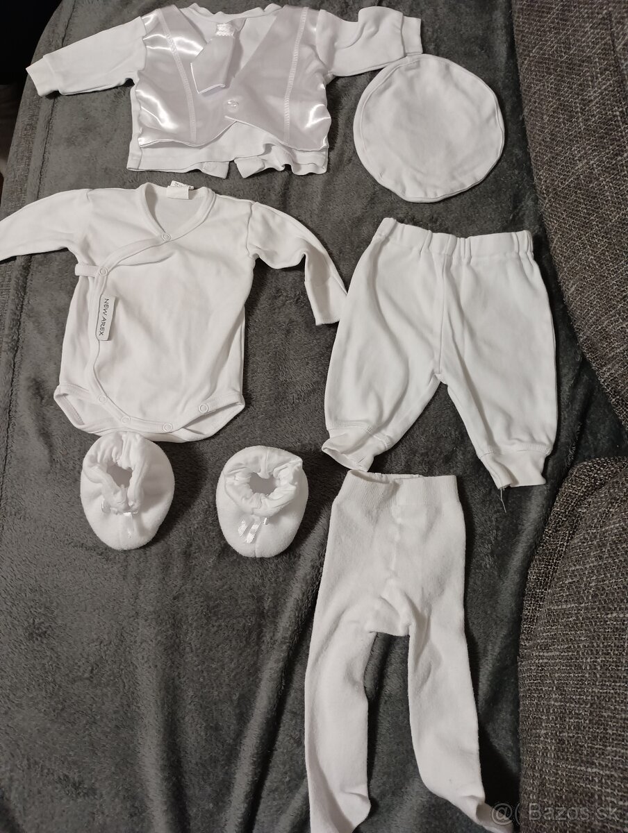 Ponúkam oblečebje pre chlapca do krstu pre chlapca. Komplet veľkosť 56-62 pozostáva z nohavíc, svetríka, ktorý má úpravu aby to vyzeralo že má chlapček na sebe vestu s kravatou a čiapky. Zvlášť dokúpené body veľkosť 56-62, punčochy veľkosť 52-62a topánočky rozmer 10 .Všetko kupované v Bábätku. Cena za komplet+ body,punčochy a topánky 35€