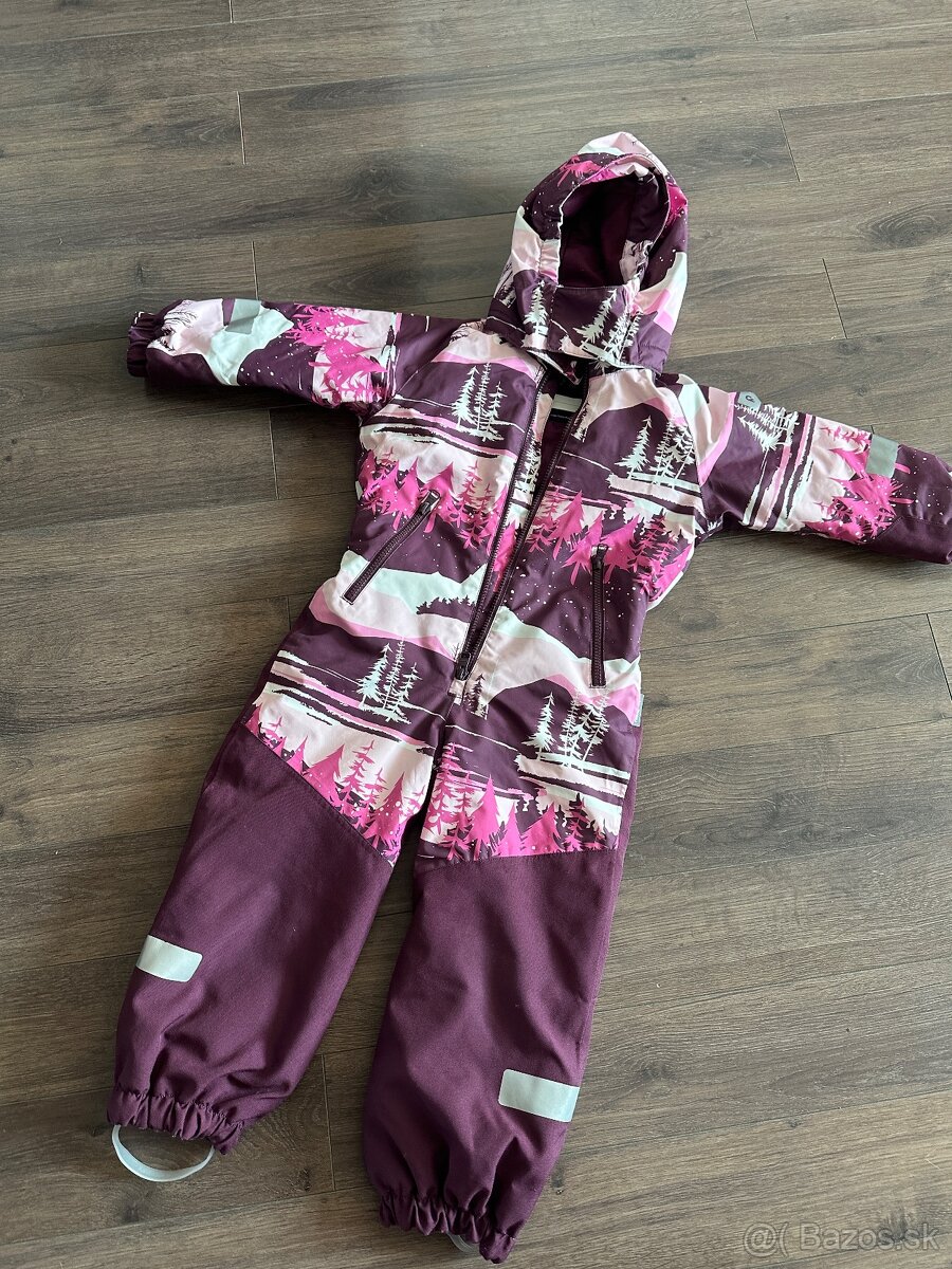 Kvalitný detský zimný overal, bez poškodenia, pevný, v nádhernej farebnej kombinácii, s odnímateľnou kapucňou, reflexnými prvkami, s gumenou úchytkou na topánky.