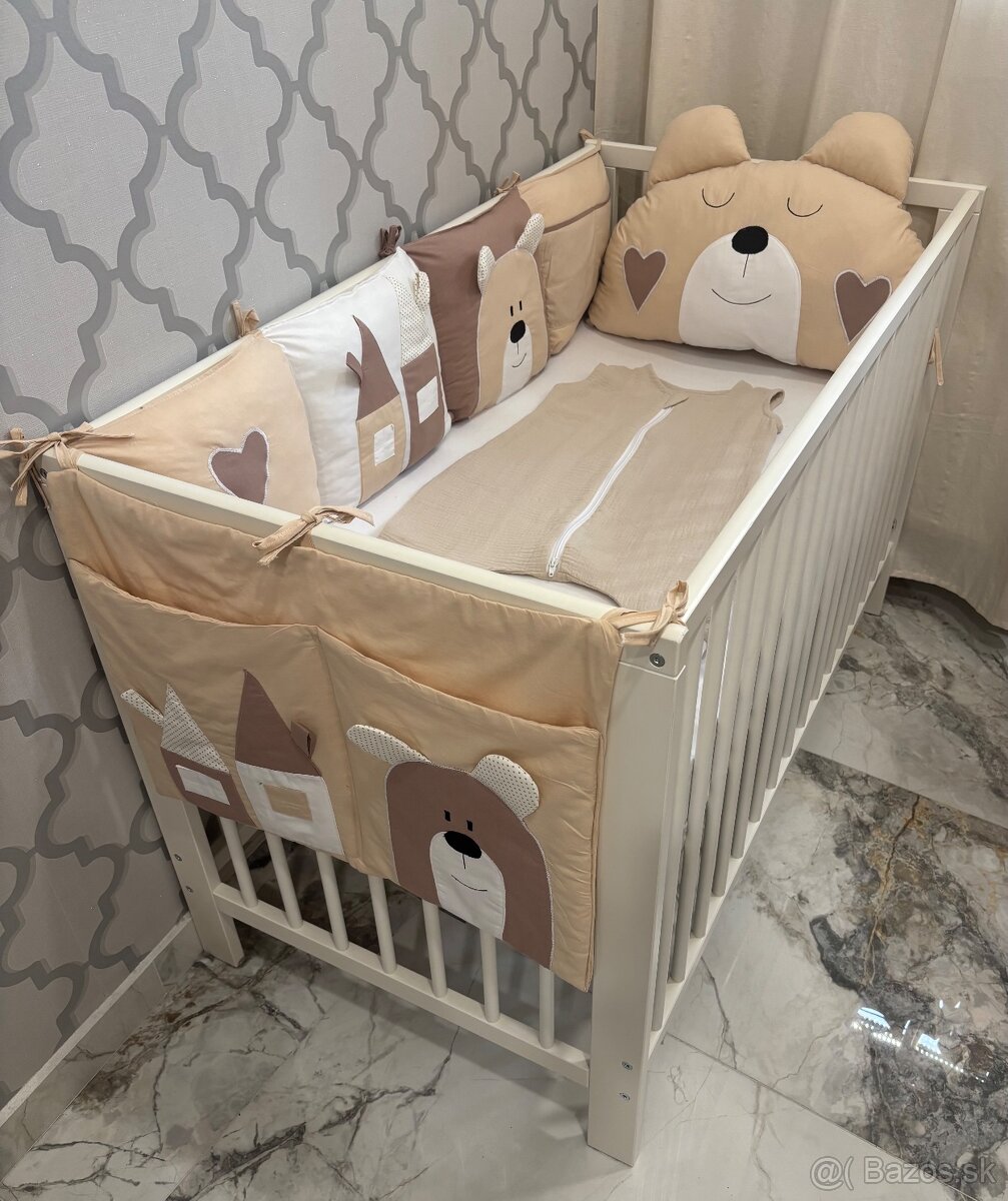 1. Vankúšikový mantinel s mackom na záhlavie zaujme dieťa hravými aplikáciami a zároveň ho ochráni pred udrením o ohrádku detskej postieľky.