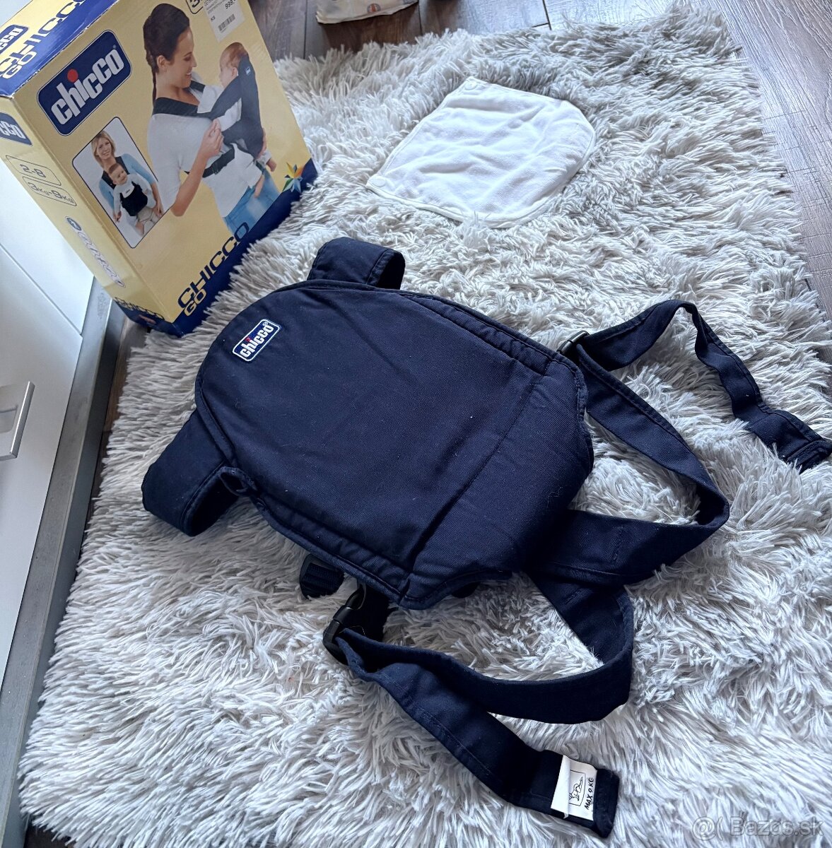 Predám nosič pre bábätka značky Chicco do 9kg v tmavomodrej farbe, originál s krabicou a náhradným podbradníkom. Možnosť nosiť bábätko k sebe, alebo od seba.