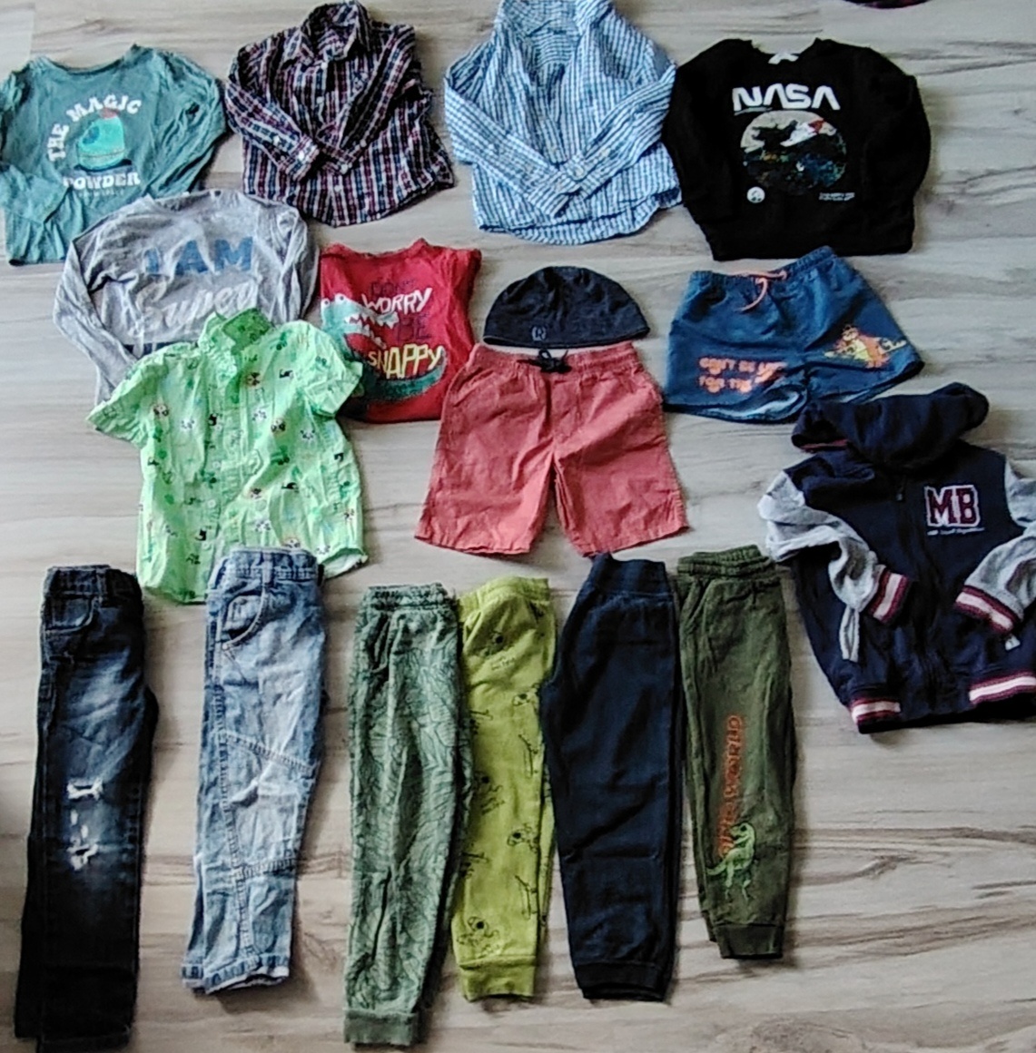 Tričko dlhý rukáv,2x tričko dlhý rukáv na donosenie,2x košeľa, čiapka,košeľa kr rukáv,plavky,kratase,mikina na doma,2x rifle, 4x tepláky aj na doma aj do škôlky,cena spolu,bez mikiny Nasa