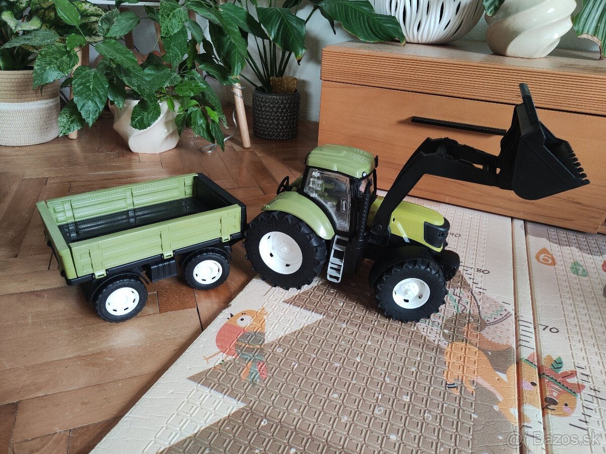 Traktor s vlečkou a prednou lyžicou v zelenej farbe. Hraný, ale bez poškodení. Veľmi pekný stav, viď foto. Značka Adriatic.