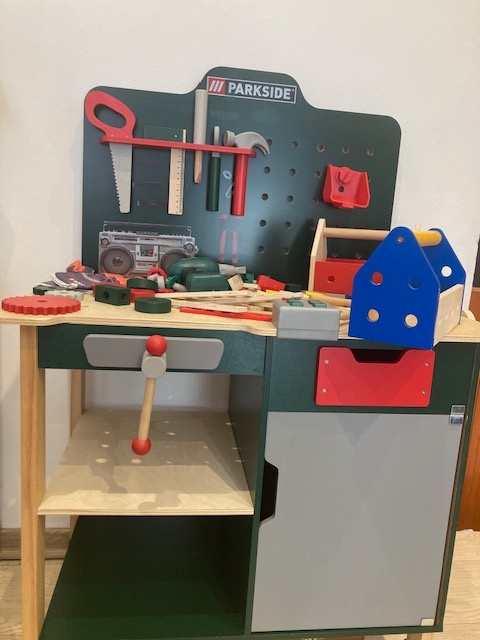 Predám detsky drevený pracovný stolík (LIDL) pridám náradie navyše. Obsahuje rôzne náradie, aj zverák. Umožňuje deťom podporovať jemnú motoriku, podporuje tvorivosť hry, šróbovanie, zatĺkanie, meranie, zatĺkanie.