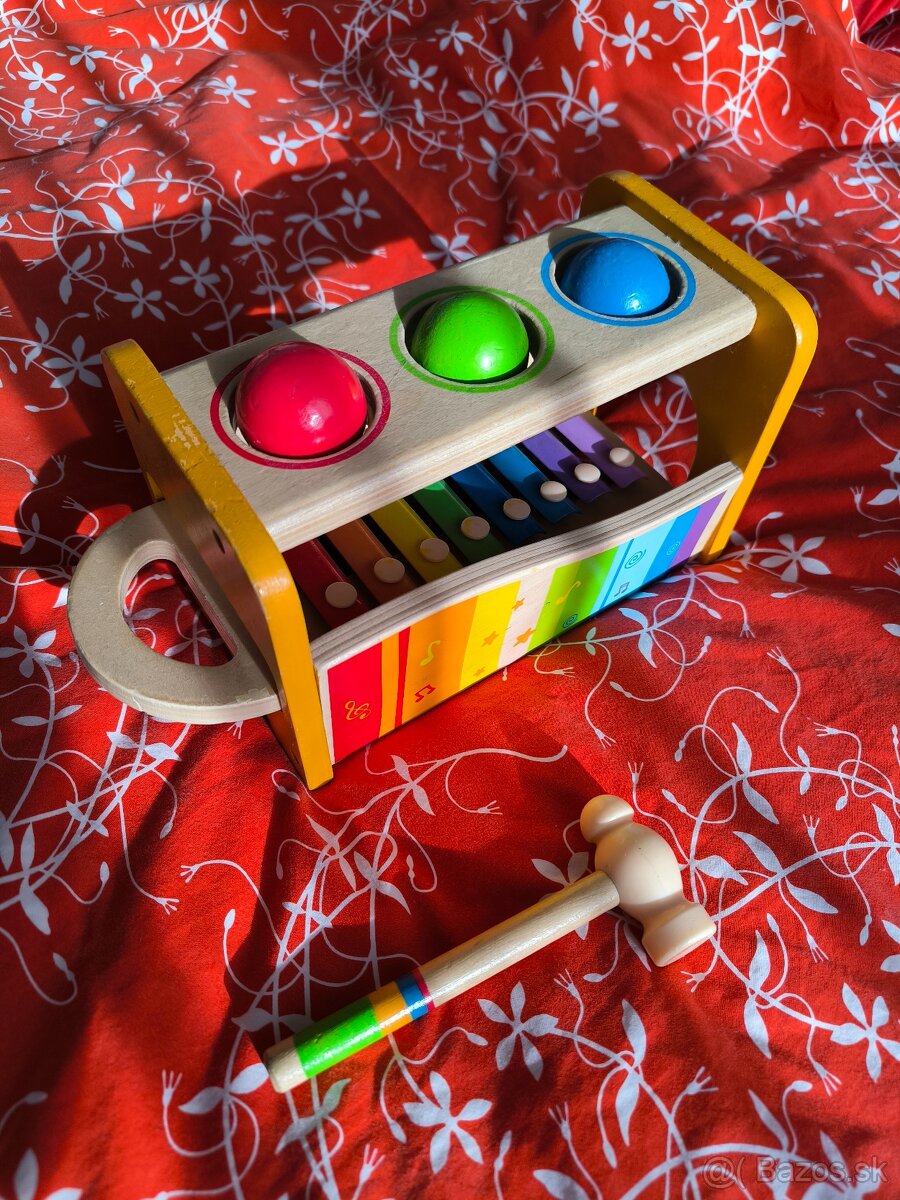 Ponúkam na predaj drevenú zatĺkačku s xylofónom značky Hape. Xylofón sa dá vybrať a možno naňho hrať aj samostatne. Hračka pozostáva zo zatĺkačky s tromi guľami, kladivko a klávesy. U nás veľmi obľúbená, viditeľné, stav na foto, kvalitný pevný materiál. Cena 4,50 EUR.