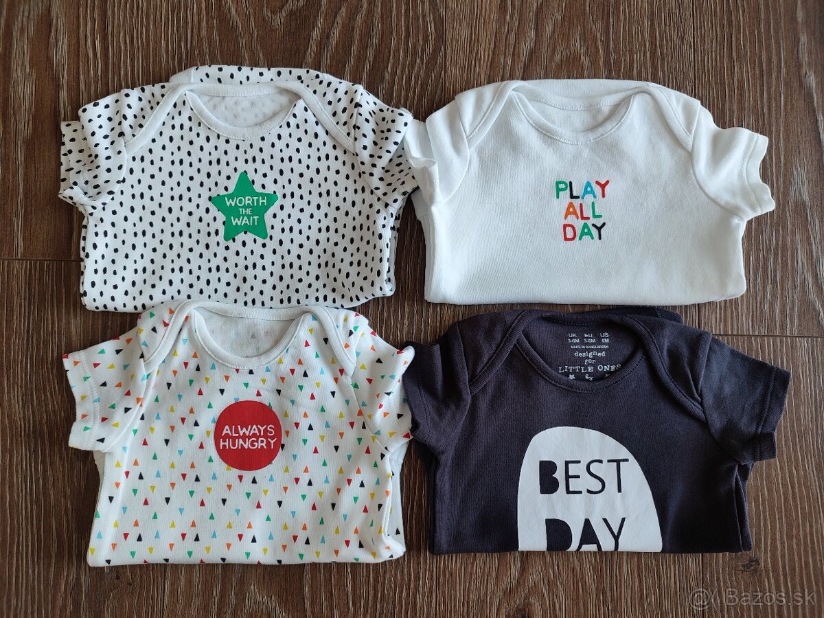 - tri biele body su nove, nenosene (iba vyprate), zabudla som na ne a nenosili sa (kupene ako trojbalenie), makka bavlna, veľkosť 3-6mes, v prípade záujmu premeriam.