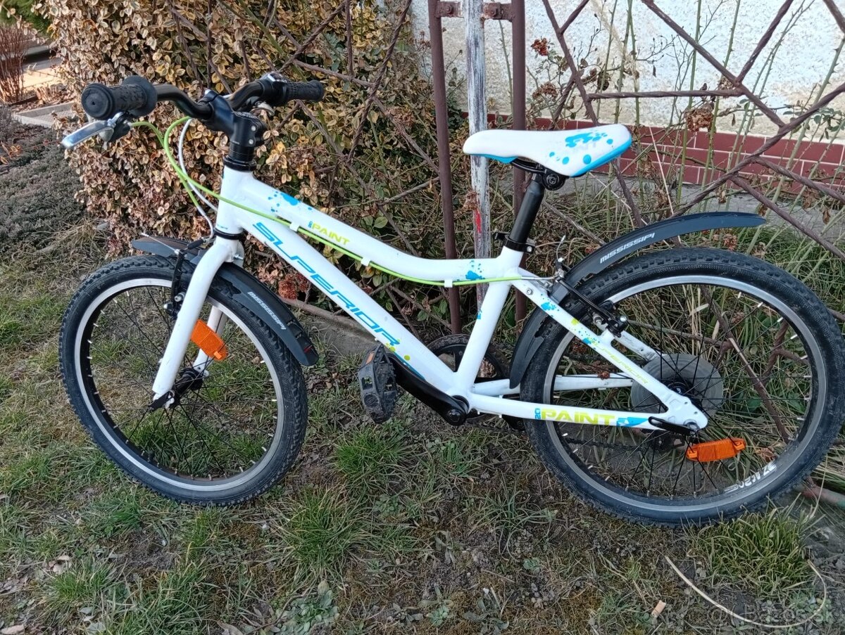 Predám detsky bicykel Superior 20"biely s blatníkmi, Al - rám,prevody 1x6 Shimano,radenie Revoshift 6 speed,V-brzdy Tektro,rýchloupináky.Zachovalý,drobné známky používania.Nie SMS