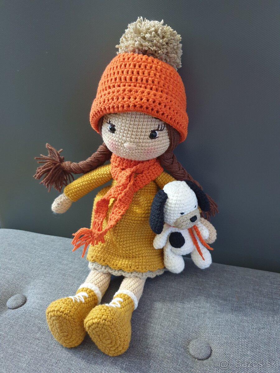 Hackovana babika pre kazdu malu slecnu ma vyplnene telo dutym vlaknom bezpecnostne oci,ciapka a salik sa daju vyzliect,saty nie,vyrobena z priadze Jeans