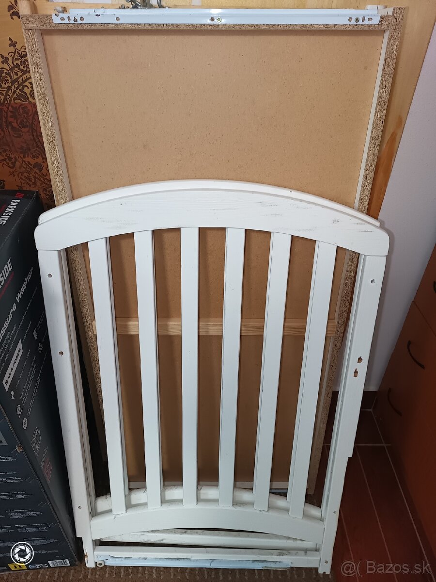Predám detskú postieľku, aktuálne už demontovanú. Postieľka bola upravovaná aby pasovala k veľkej posteli, takže má pár vád ako zúžené nožičky a 4 vyvrtane diery naviac (na vhodnejšie umiestnenie bočného zábradlia.