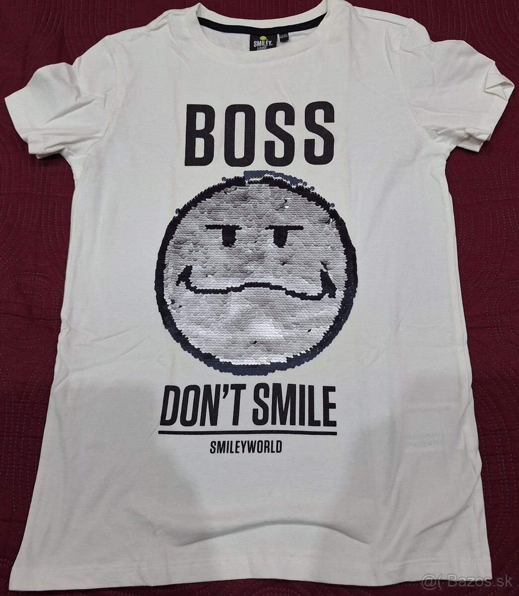 Predám staršie chlapčenské tričko krátky rukáv s meniacim motívom, BOSS DON´T SMILE, zn. SMILEY WORLD, veľkosť č. 146/152, cena 1 €