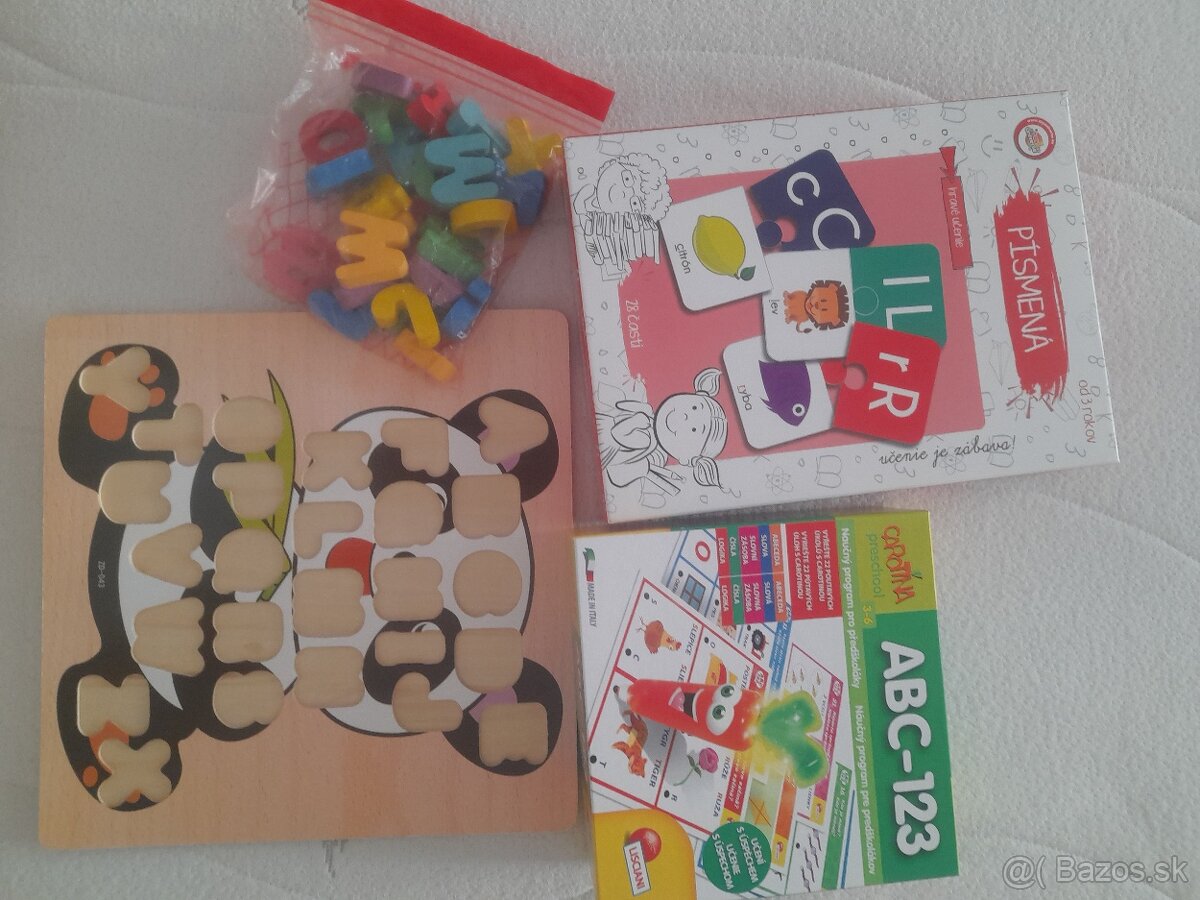 Predám spolu 3 hry o písmenách. Vhodné už od 2 rokov. Prvá hra: písmenka na doske. Dieťa sa pri tom nauči farby, vkladať písmenko do spravneho políčka a neskôr aj dané písmená. Druhá hra- písmena. Ide o puzzle,kde spája písmeno s obrázkom. Koordinácia oko-ruka. Tretia hra-ABC-123 vhodné pre predškoláka. Nachádza sa tu 22 zábavných úloh,kde pomocou mrkvičkového pera dieťa zadáva správnu odpoveď. Úlohy sú pre písmenka aj čísla. Všetko spolu. Cena 12 eur. Osobný odber.