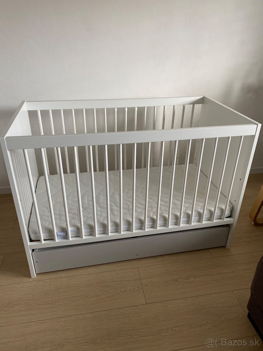Detská postieľka 120x60 + kvalitný matrac + 2x plachta - [9.3. 2026]Biela detská drevená postieľka Kamilka 120x60. Po jednom dieťati, využitá cca 6 mesiacov. k posieľke sú aj koliečka. Sťahovanie bočnice, možnosť vymeniť bočnicu za krátku (tú sme ani nepoužili), polohovateľná hore-dolu. postieľka je zložená. Pôvodná cena 160eur.