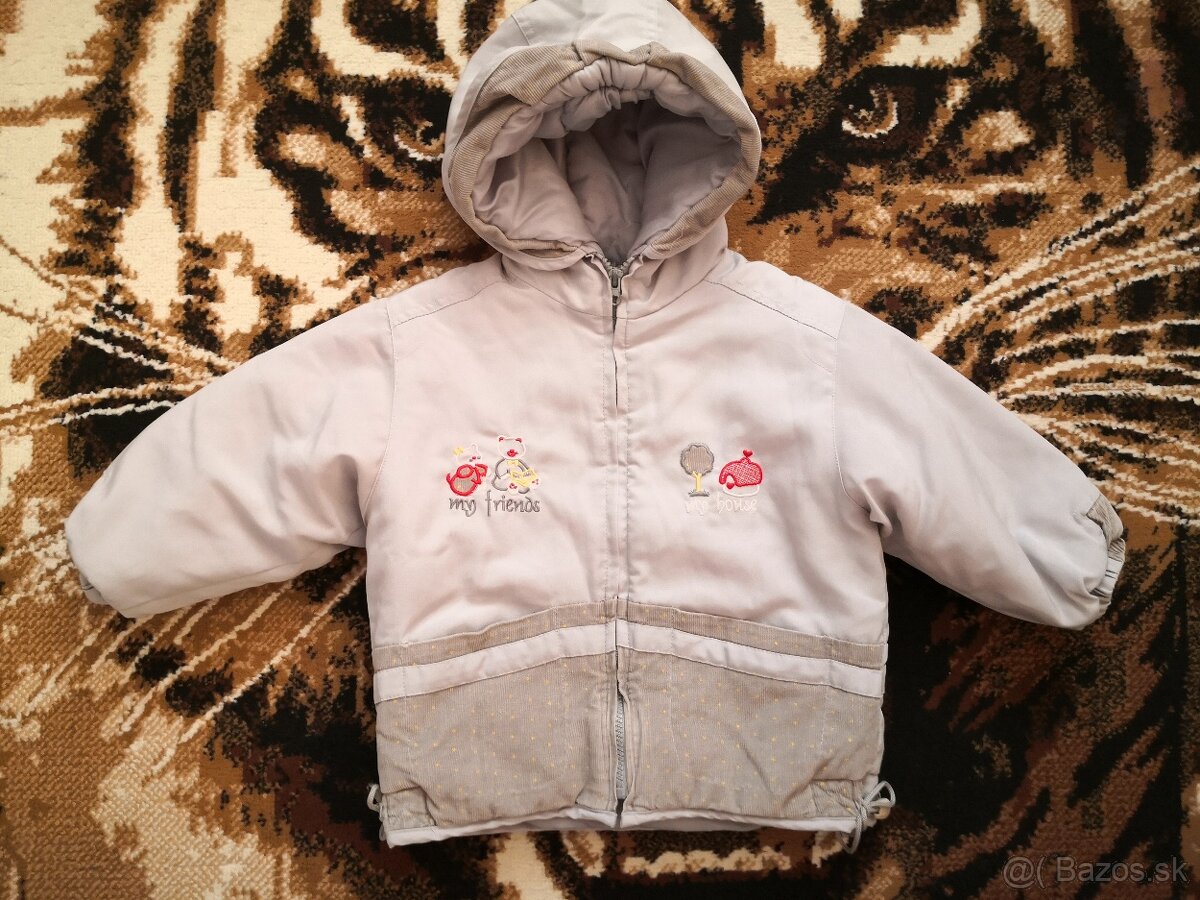 Posuniem teplú bundu. Rozpätie rukávov merané na voľno 88 cm. Veľkosť odhadujem na max. 98. Od pleca dole 44 cm. Vpredu 2 vrecká. Rukávy na gumku. Na pravom boku chýba ukončenie šnúrok. Ináč bez chýb. S poštovným 5 €.