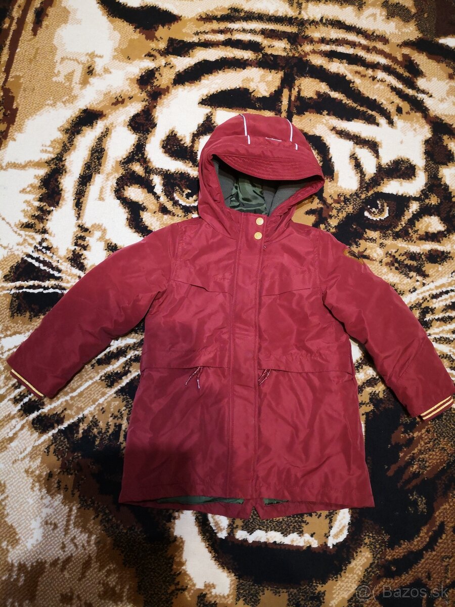 Párkrát oblečená bunda bordovej farby, zn. Nappies. Ako nová. Bez poškodení. Predĺžený chrbát, kapucňa so strieškou, reflexné prúžky na kapucni. Trblietavý efekt na vnútorných rukávoch a šnúrkach.