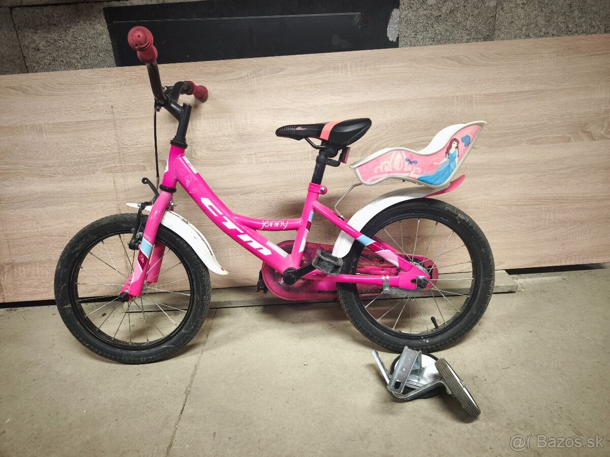 Predam detský bicykel zn.CTM velkosť 16 v dobrom stave bez skrabancov, bez hrdze. Predavam vsetko ako je na foto aj s pomocn. kolieskami. Kupovane v MTsport Lokca
