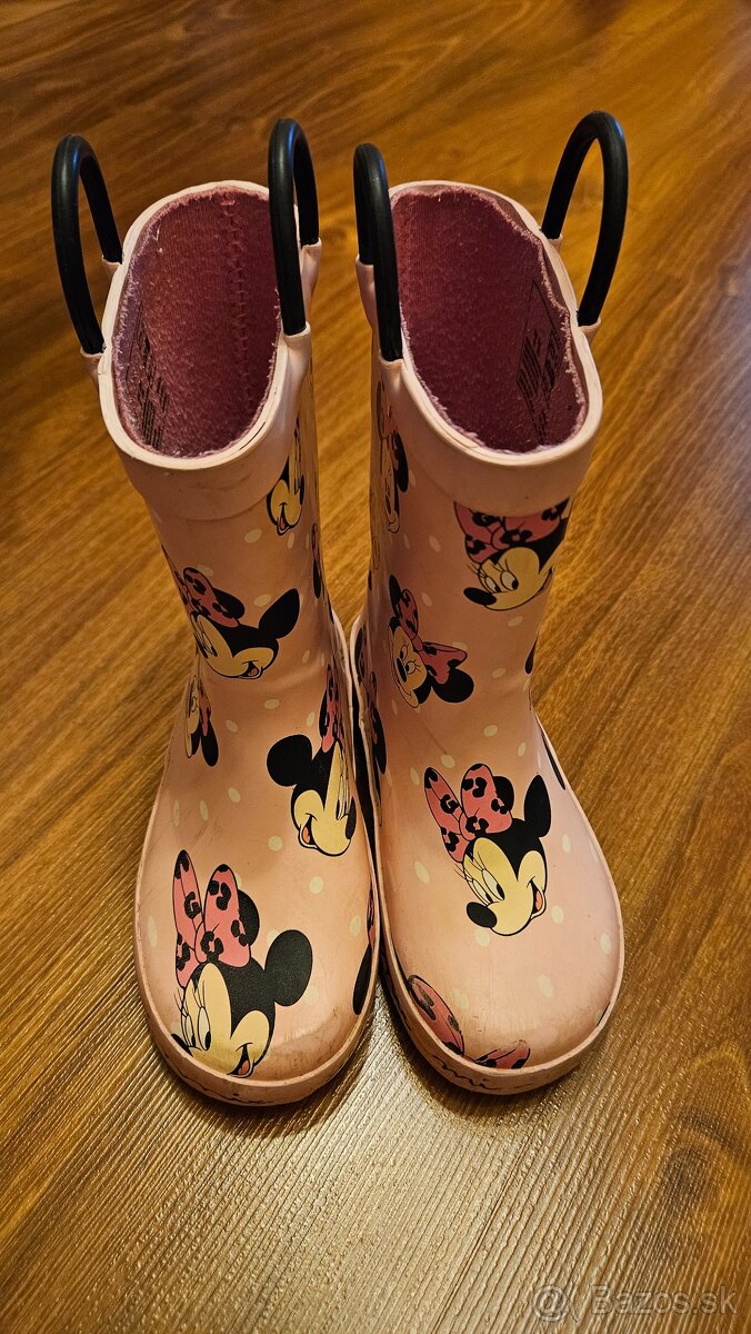 Predám gumáky značky F&F veľkosť 26. Vnútri je textilná stielka pre pohodlnejšie nosenie a lepšiu tepelnú izoláciu. Gumáky sú z mäkkej gumy, podrážka je ohybná. Vďaka dvom uškám na každej čižme sa gumáky deťom ľahko obúvajú. Vnútorná dĺžka je 17 cm.